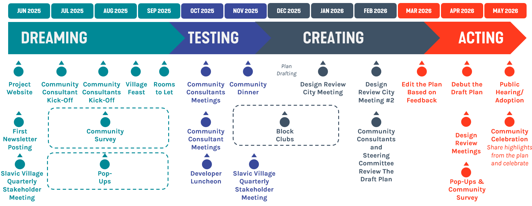 - Phase 4 Acting | The plan will be finalized using the latest feedback, adopted, and shared out so we can start implementing the plan and making your vision a reality.